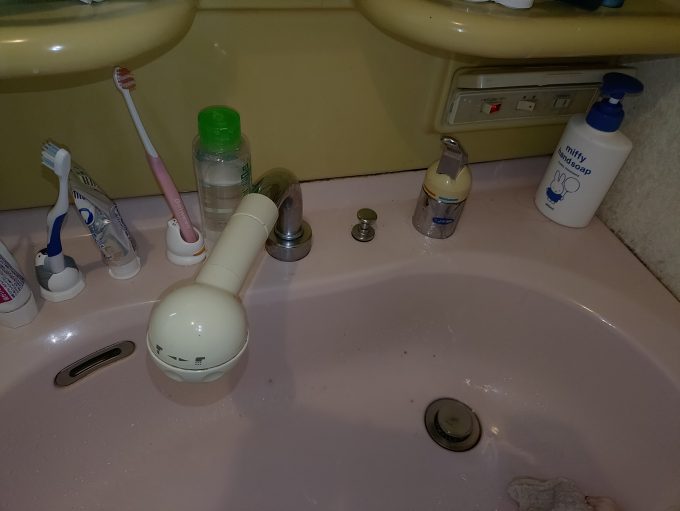 確認してみると、下げ吐水の蛇口で30年以上前から使用しているとのことでした。現在は一般的に上げ、吐水の蛇口になっているので交換をご提案しました。