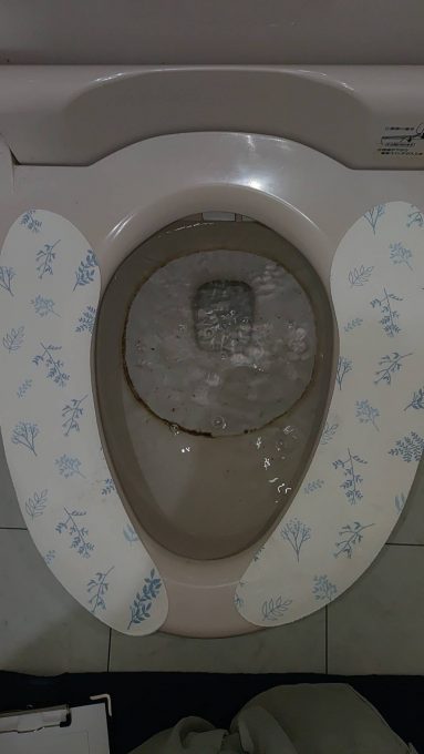 お話を聞くと、今朝トイレが詰まったと言われたとのことでした。確認すると紙のようなものが浮いていました。