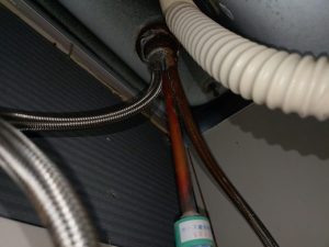 お伺いさせていただくと、「洗面蛇口から水が下に漏れている」とのことでした。
