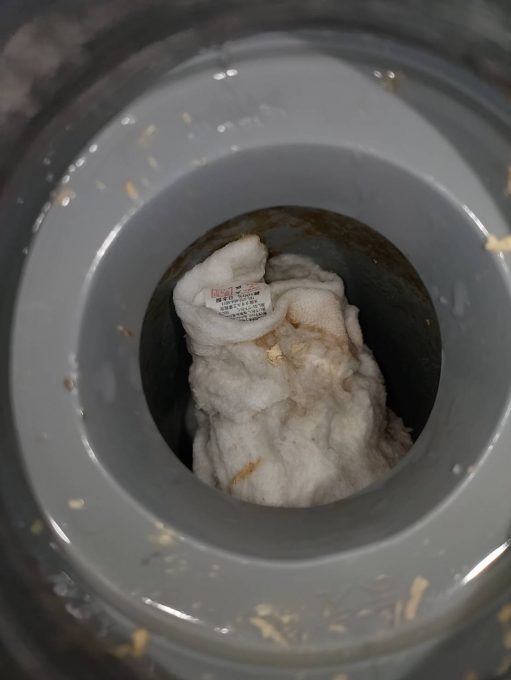 外してみると、排水管にタオルが落ちており、それが原因で詰まりをおこしていました。